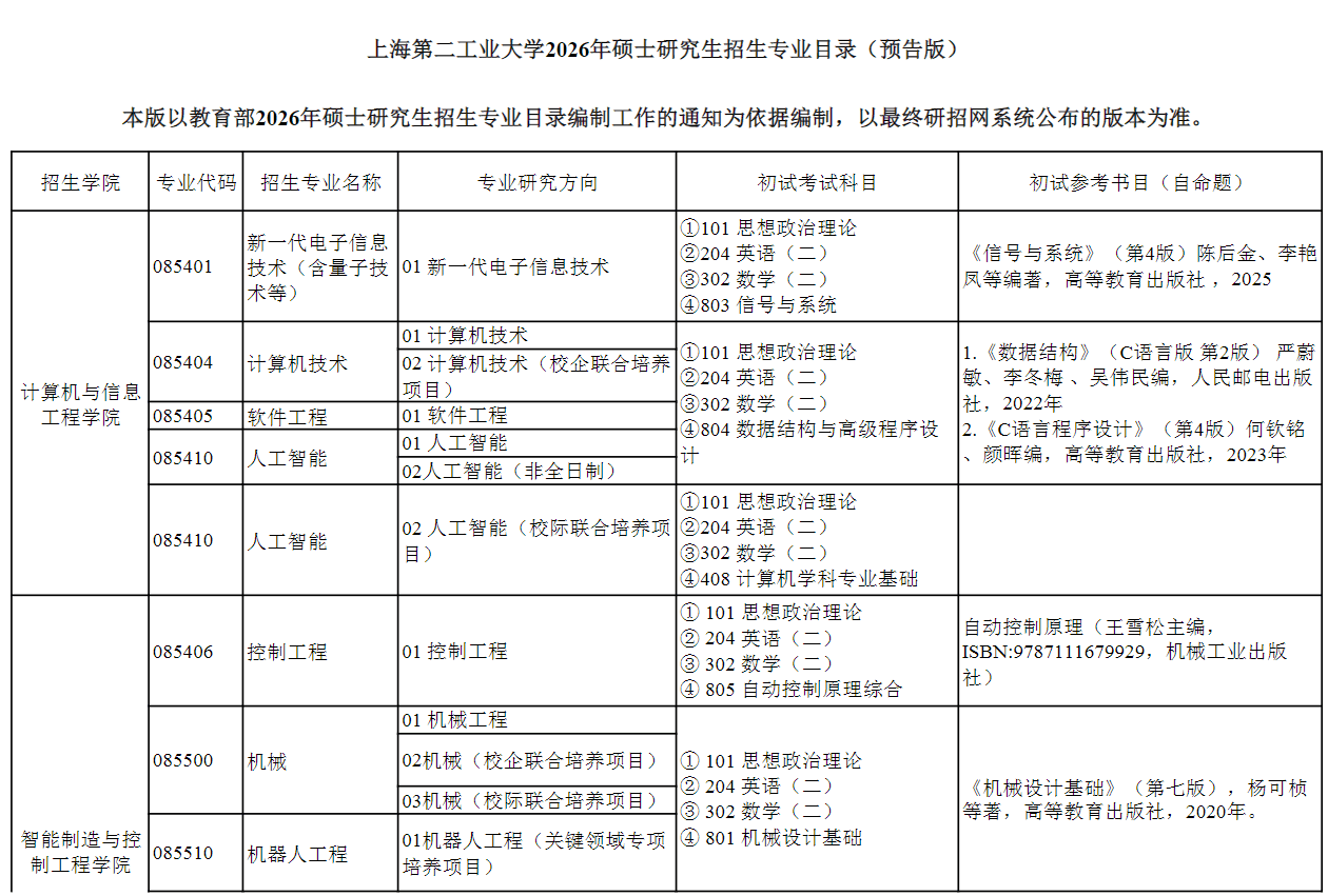 上海第二工业大学2026年年硕士研究生招生专业目录