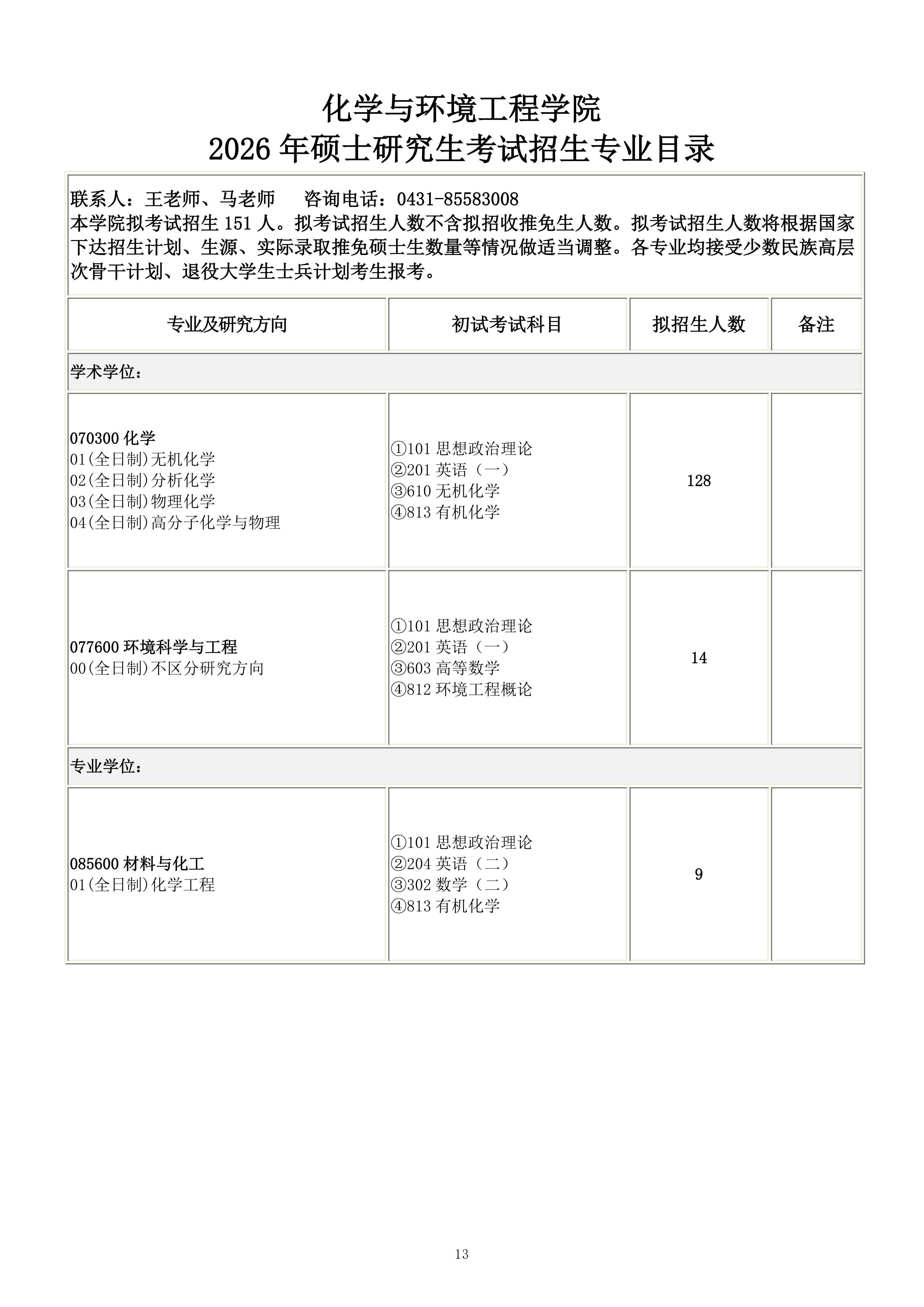 长春理工大学化学与环境工程旭学院2026年考研招生专业目录