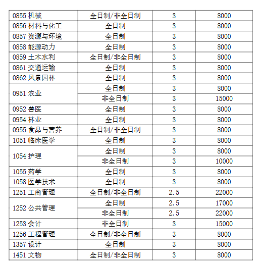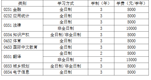 硕士研究生学习方式分为全日制和非全日制。全日制和非全日制研究生考试招生依据国家统一要求,执行相同的政策和标准。学术学位学习方式均为全日制,学制3年,每学年学费8000元。专业学位学习方式、学制和学费见下表: