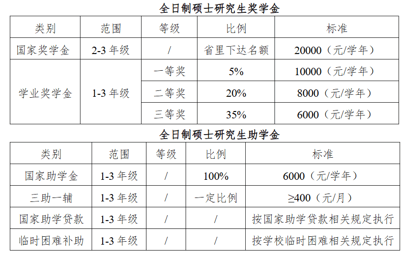 (二)奖助:学校对全日制硕士研究生提供各种奖、助学金,具体如下: