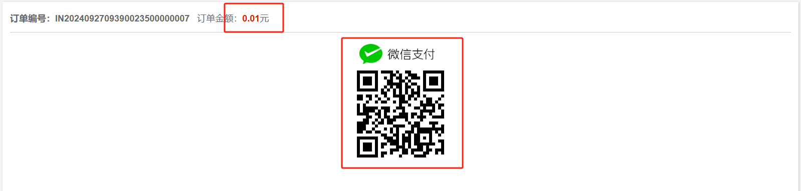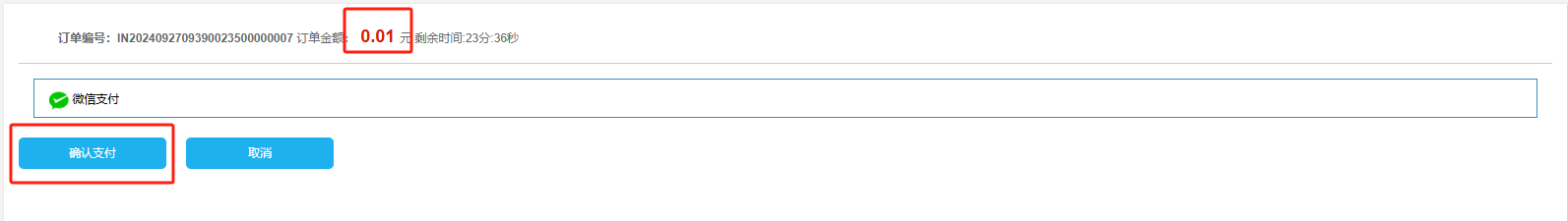 页面跳转后,确认订单金额,点击确认支付,支付渠道为“微信支付”。点击后,页面将跳转为微信支付的二维码,再次确认金额无误后,用手机微信扫码支付。截图为测试账号,推免复试费100元/人。