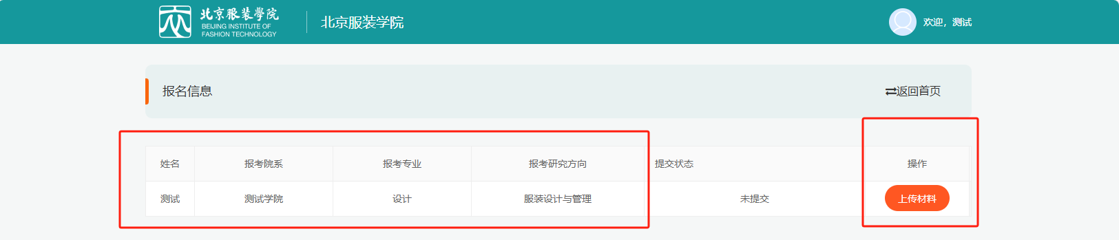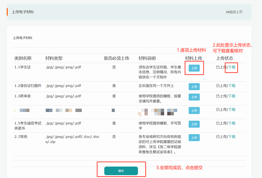 按照《北京服装学院2026年推免硕士研究生复试办法》及学院的要求,逐项上传电子材料。上传页面上会显示需要提交的具体材料类型和格式,点击【上传】按键,上传对应的材料。上传成功后,上传状态将显示“已上传”,可下载查看核对。