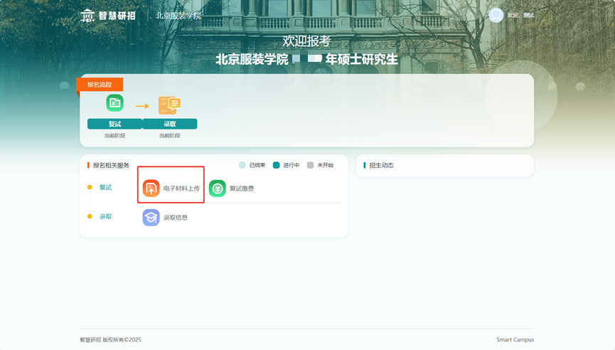 点击【电子材料上传】,页面跳转后,确认报名信息无误,然后点击【上传电子材料】。