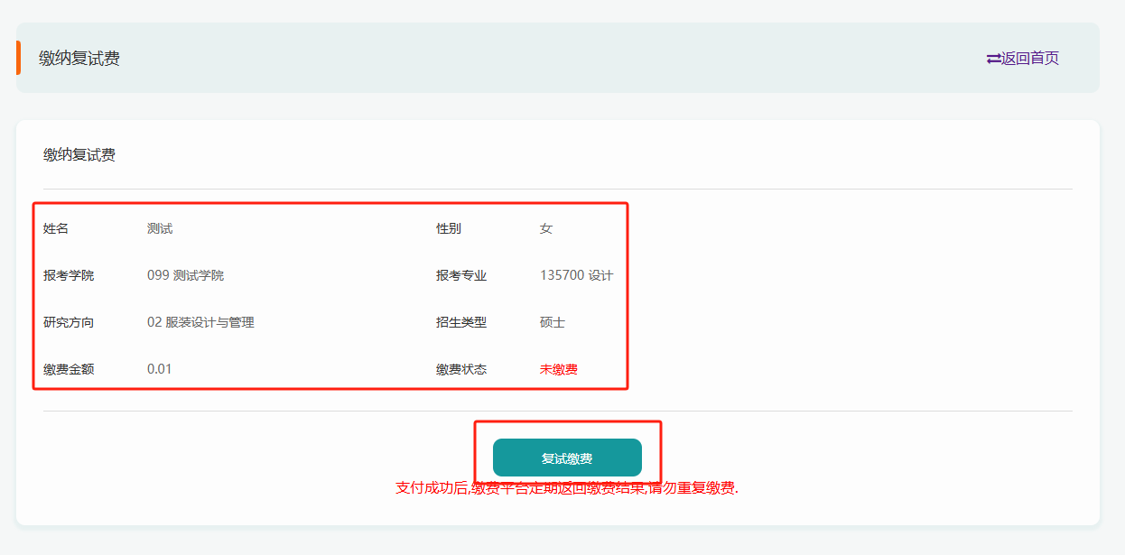 点击【复试费缴纳】,页面跳转后,确认报名信息无误,然后点击【复试缴费】。