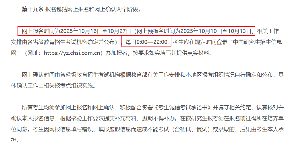 教育部已经正式发布了《2026年全国硕士研究生招生工作管理规定》的通知,其中2026年考研报名时间为网上报名时间为2025年10月16日至10月27日(网上预报名时间为2025年10月10日至10月13日,相关工作安排由各省级教育招生考试机构确定并公布),每日9:00—22:00。考生应在规定时间登录“中国研究生招生信息网”(网址:https://yz.chsi.com.cn)参加报名,按要求如实填写并提供真实材料。