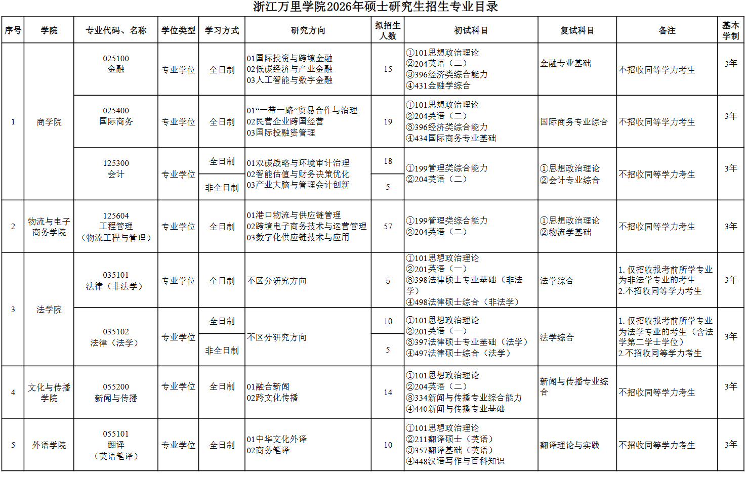 专业及研究方向人数初试科目备注030100 法学【全日制学术学位】01法学理论-①101思想政治理论 ②201英语(一)或202俄语或203日