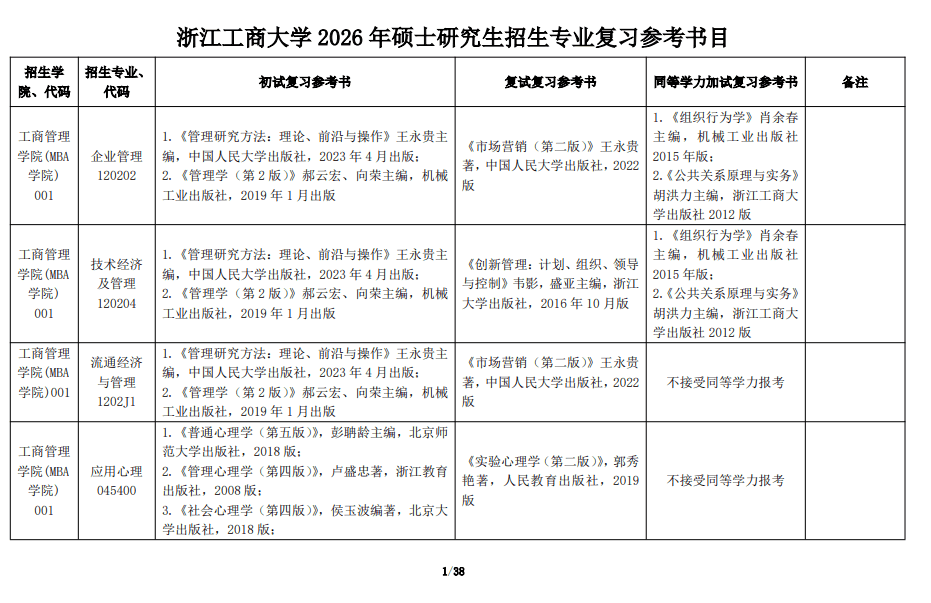 浙江工商大学2026年硕士研究生招生专业复习参考书目