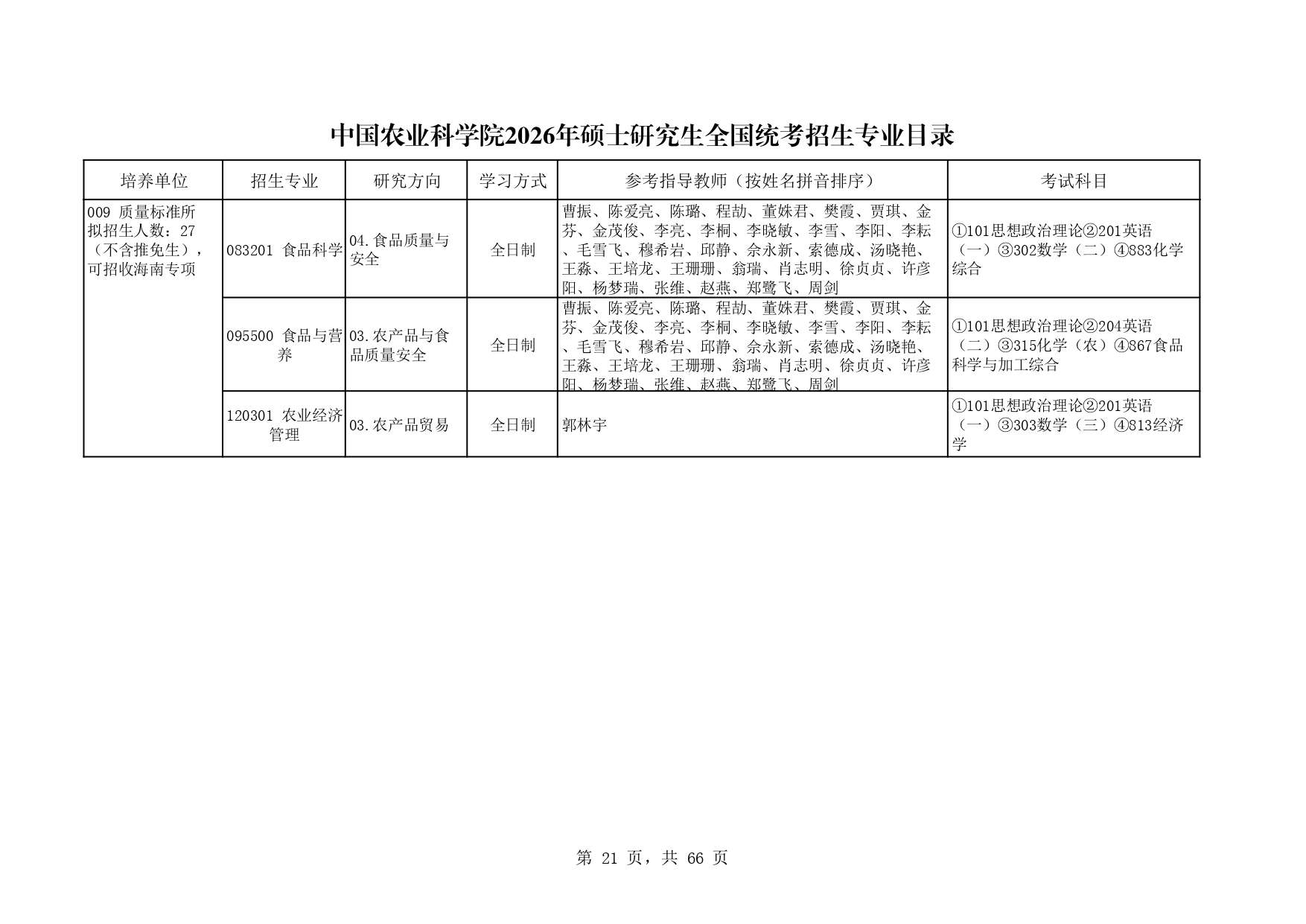 中国农业科学院质量标准所2026年研究生招生专业目录