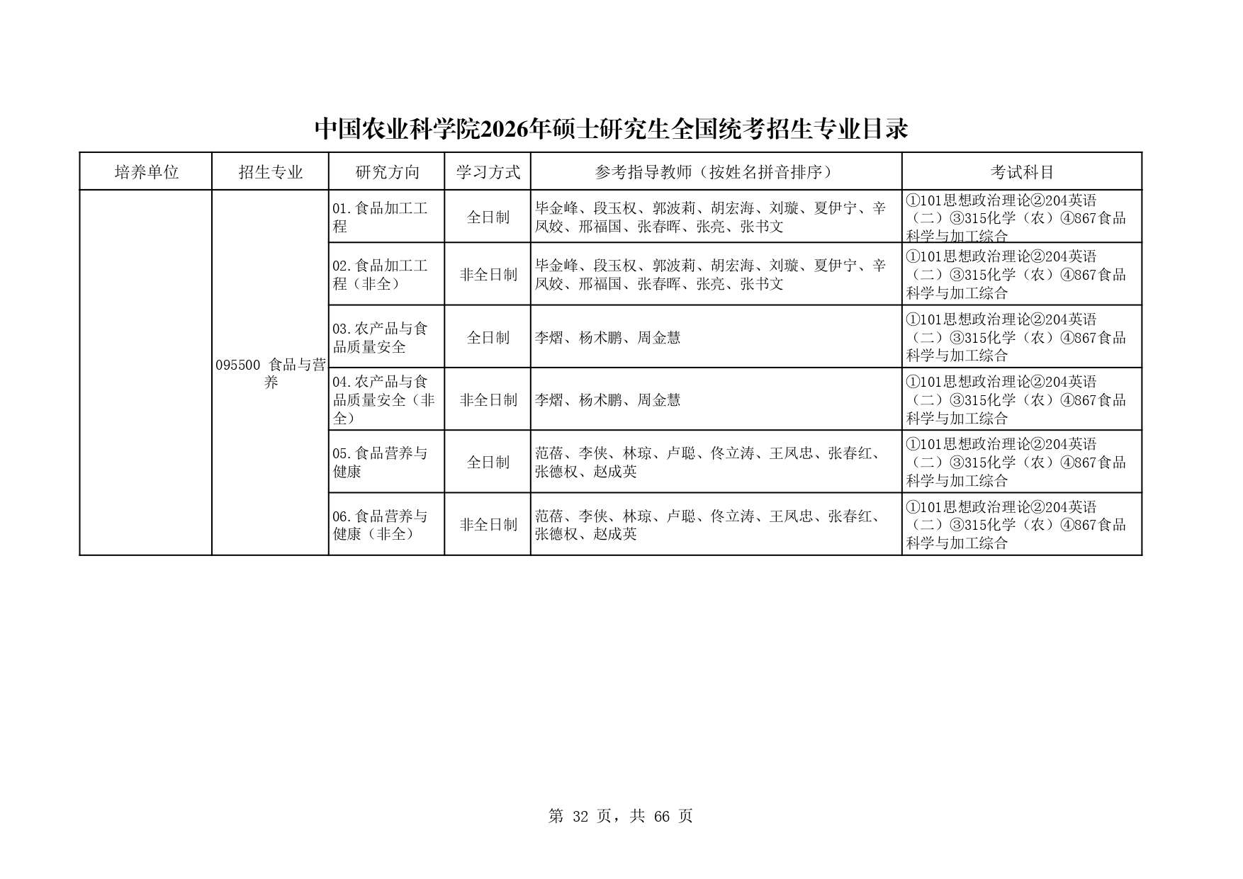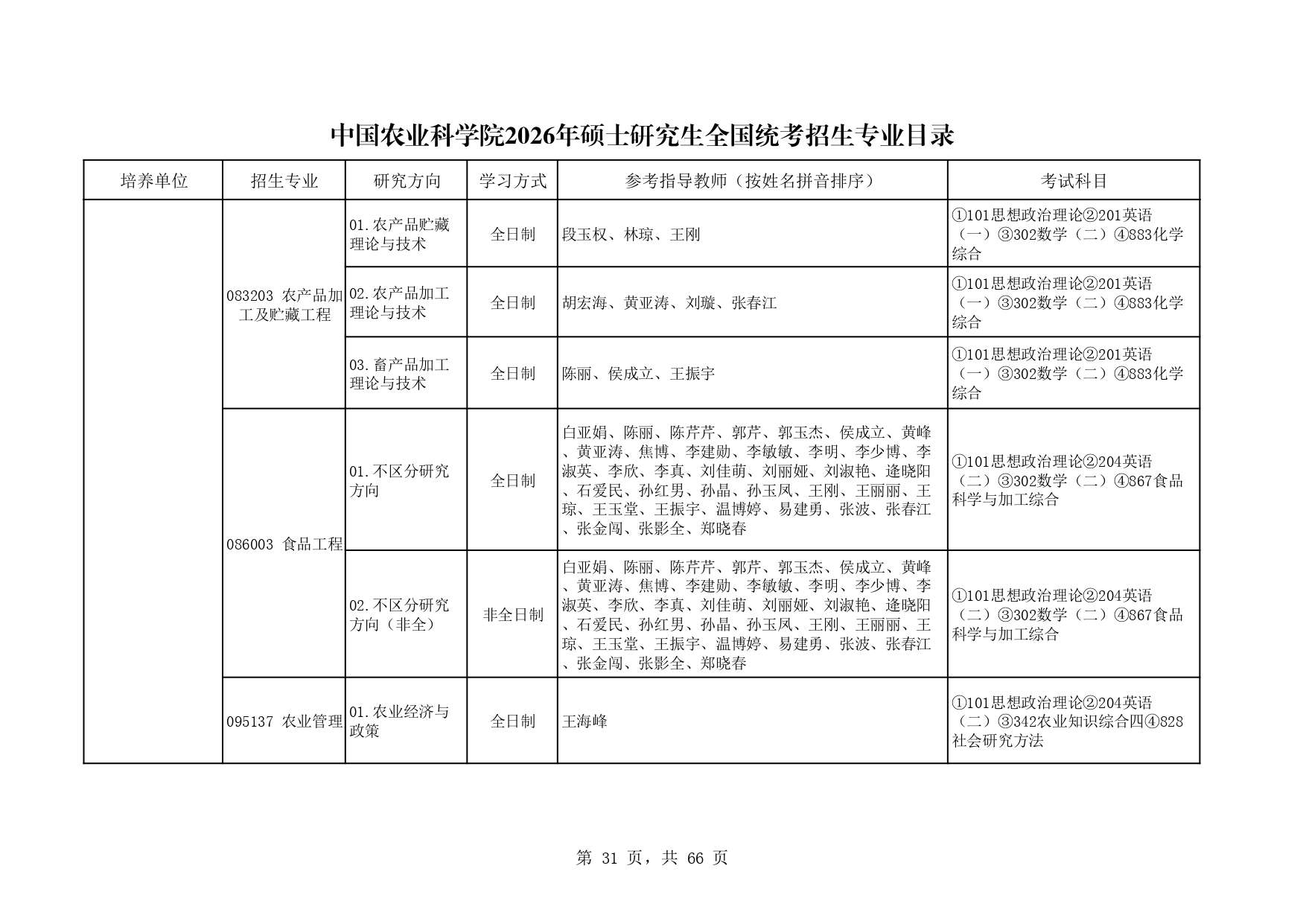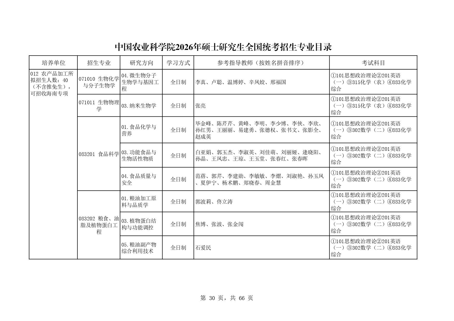 中国农业科学院农产品加工所2026年研究生招生专业目录