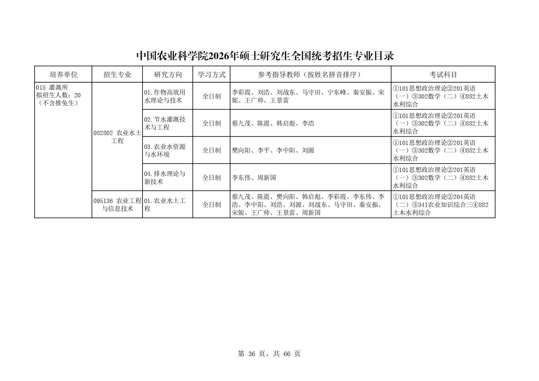中国农业科学院灌溉所2026年研究生招生专业目录