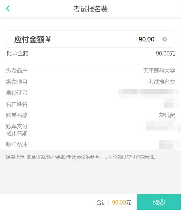 第二步:核对姓名、金额、账单备注的缴费信息无误,点击右下角缴费,请大家尽快完成网上交费事宜。