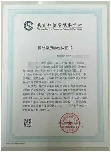 教育部留学服务中心出具的认证报告照片示例