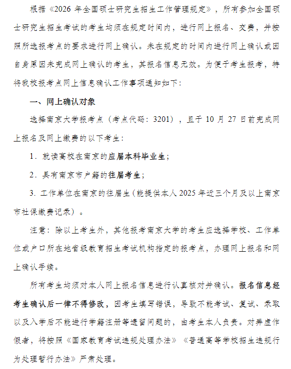 根据教育部及上级教育考试主管部门要求,2026年全国硕士研究生招生考试南京审计大学报考点(3233)采用网上确认方式,现将具体工作公告如下