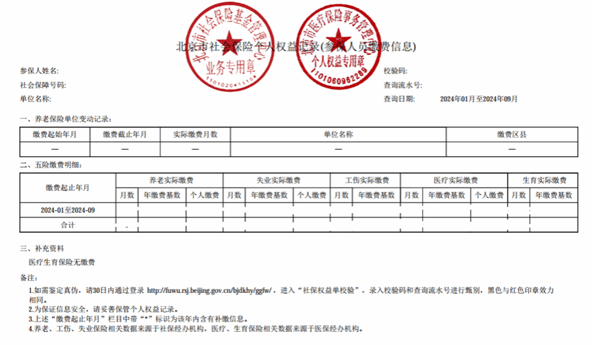 工作所在地在京考生:须提供2025年(1月至9月)在京连续缴纳6个月(含)以上社会保险中的基本养老保险或基本医疗保险(不含补缴,工作单位与社保缴纳单位要一致)缴纳记录,可到“北京市人力资源和社会保障局官网”上查询打印。缴费起止年月选择2025年1月到2025年9月之间的任意连续6个月(如:2025.01-2025.06、2025.02-2025.07……2025.04-2025.09),上传时需对网站上下载生成的《参保人员缴费信息》PDF文件进行截图上传(文件中应带有“北京市社会保险基金管理中心业务专用章”和“北京市医疗保险事务管理中心个人权益专用章”),缴费明细部分中,缴费起止年月栏目中不能带有“*”号标识,在养老实际缴费和医疗实际缴费栏目中至少有一个栏目有6个月的缴费记录。对缴纳中央国家机关养老保险的考生参照北京市社保缴纳记录执行。