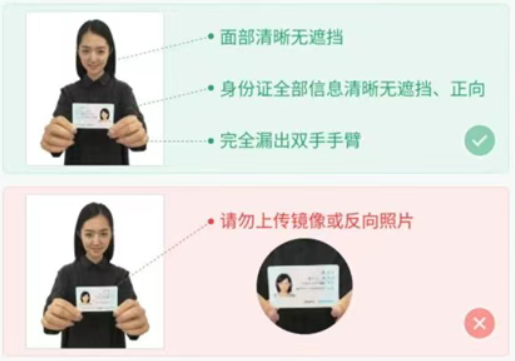 ①拍摄时,手持本人身份证,将持证的手臂和上半身整个拍进照片,头部和肩部要端正,头发不得遮挡脸部或造成阴影,要露出五官;