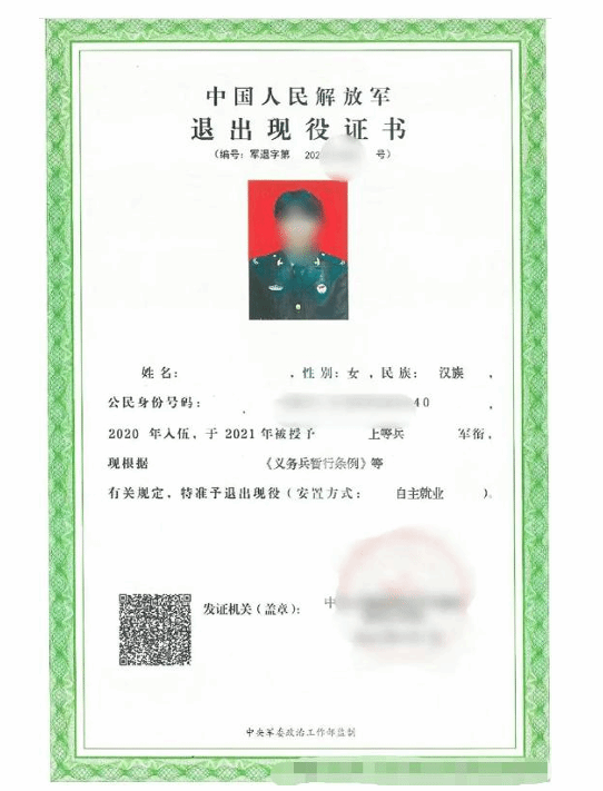 (义务兵退出现役证示例照片)