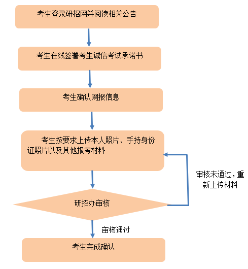 考生须于上述规定时间内登录网上确认系统,按系统提示及要求完成“阅读网报公告、同意考生诚信考试承诺书、网报信息确认、填写身份证有效期、上传准考证照片、上传手持身份证照片及其他相关材料照片”等流程。图片上传过程请耐心等待,不要频繁刷新。