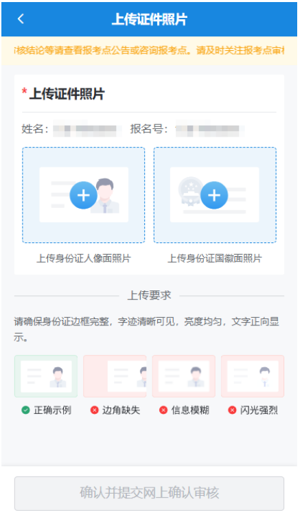 ②考生证件类型为居民身份证但身份证鉴证人脸比对不通过、身份证有效期比对不通过或证件类型不是身份证的考生,需要上传证件照片。有效期内身份证人像面、本人身份证国徽面,分正、反面两张上传,请确保身份证边框完整,字迹清晰,亮度均匀。