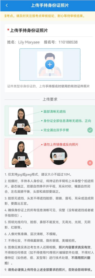 (2)考生本人手持身份证照片(所有考生必须上传)
