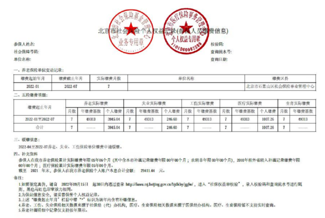 社保缴费记录单获取方式:进入北京市人力资源和社会保障局社会保险权益查询服务(网址: http://fuwu.rsj.beijing.gov.cn/bjdkhy/ggfw/f/07),登录后,点击“参保人员缴费信息查询”,查询2025年在京连续缴纳6个月(含)以上社会保险中的基本养老保险或基本医疗保险(不含补缴;)的参保记录,点击“下载打印”,打开下载的PDF文件,截屏提交。因权益记录验证时间限制,打印时间须在10月28日-11月5日,为避免网络拥堵或打印人数限制,请考生务必及时申请。如使用过程中遇到问题,请在正常工作日9:00-12:00、14:00-18:00时间段内拨打技术支持电话:18519058048,社保政策咨询电话12333。