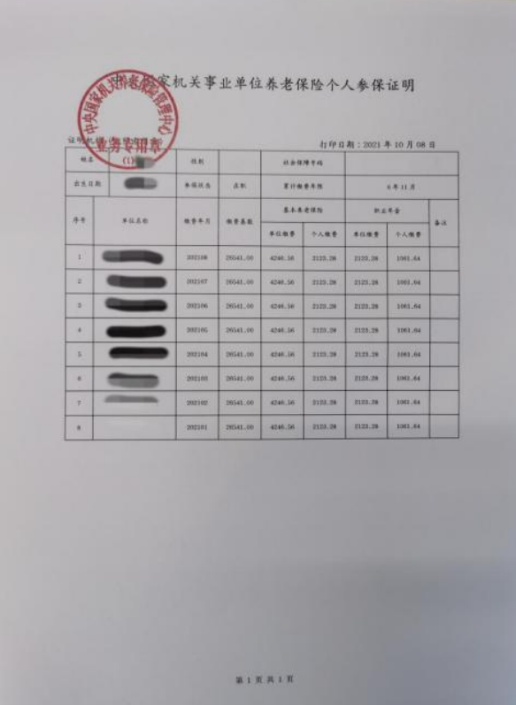 《中央国家机关事业单位养老保险个人参保证明》样例: