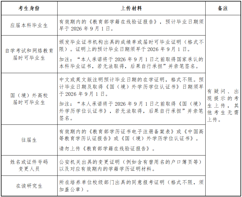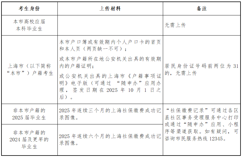 (二)首次上传材料。时间:2025年10月31日(周五)8:00至11月5日(周三)12:00,逾期不能上传。强烈建议考生尽快完成首次上传,以免因审核不通过无充足时间准备、提交复审材料。