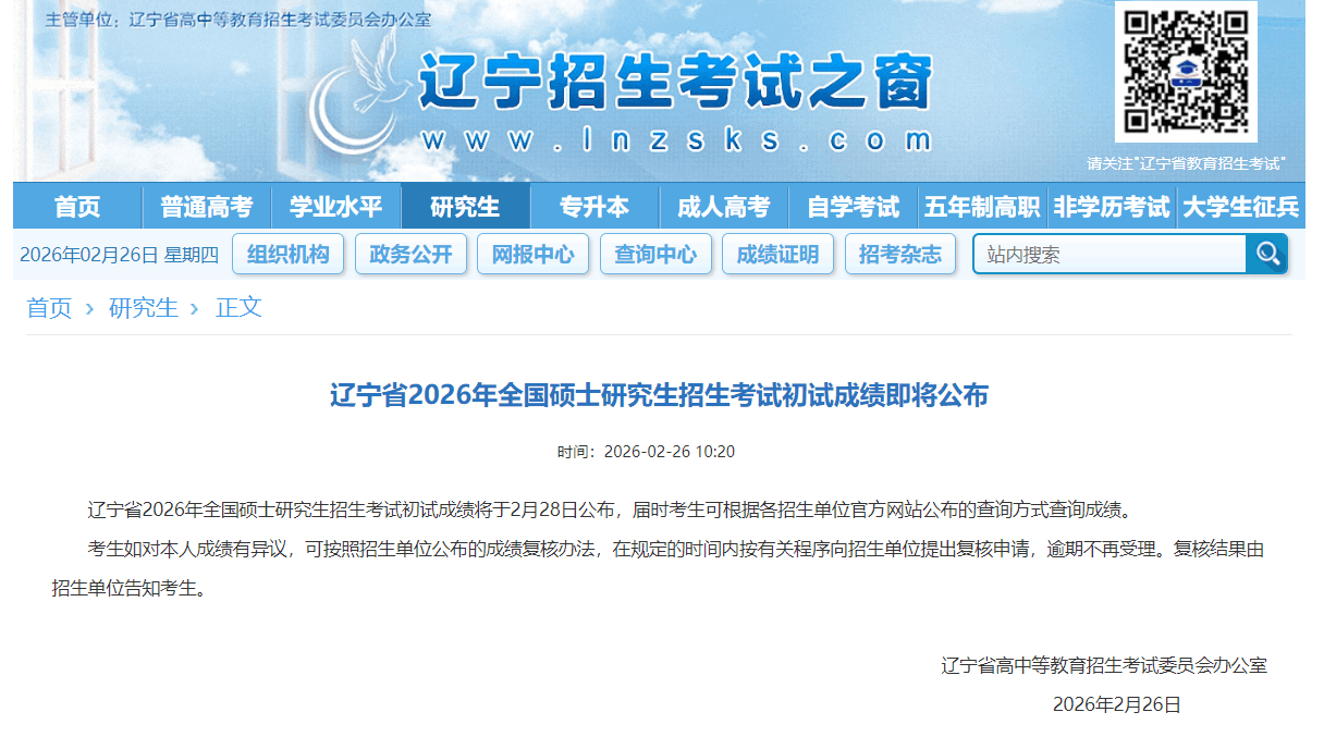 辽宁省2026年全国硕士研究生招生考试初试成绩将于2月28日公布,届时考生可根据各招生单位官方网站公布的查询方式查询成绩。