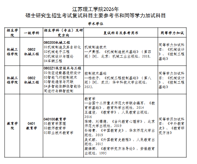 江苏理工学院2026年考研复试科目主要参考书和同等学力加试