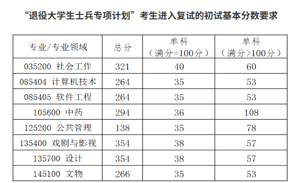 “退役大学生士兵专项计划”考生进入复试的初试基本分数要求