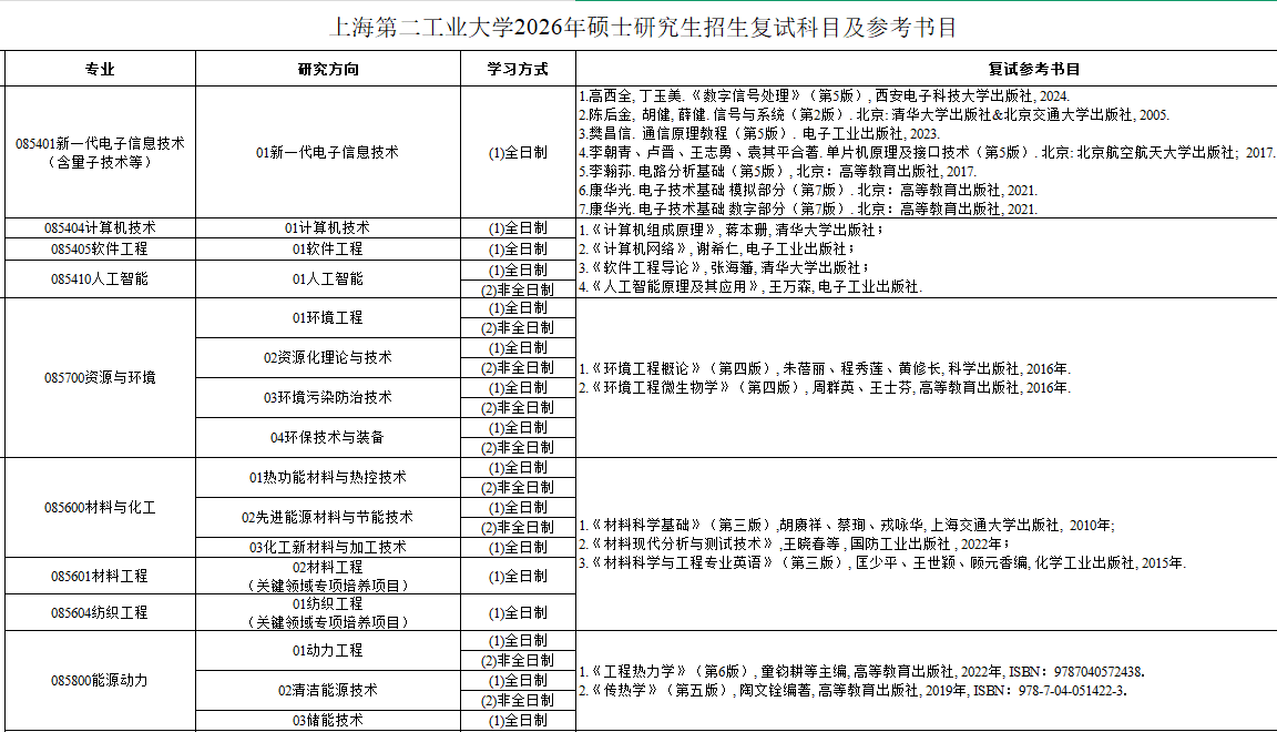 上海第二工业大学2026年考研复试含同等学力科目及参考书