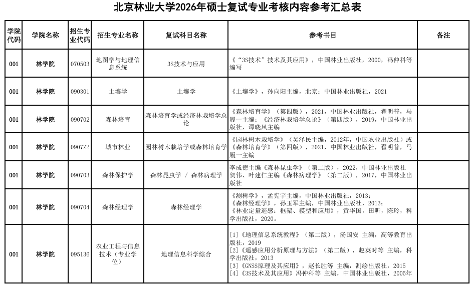 北京林业大学2026年考研复试专业考核内容参考汇总表