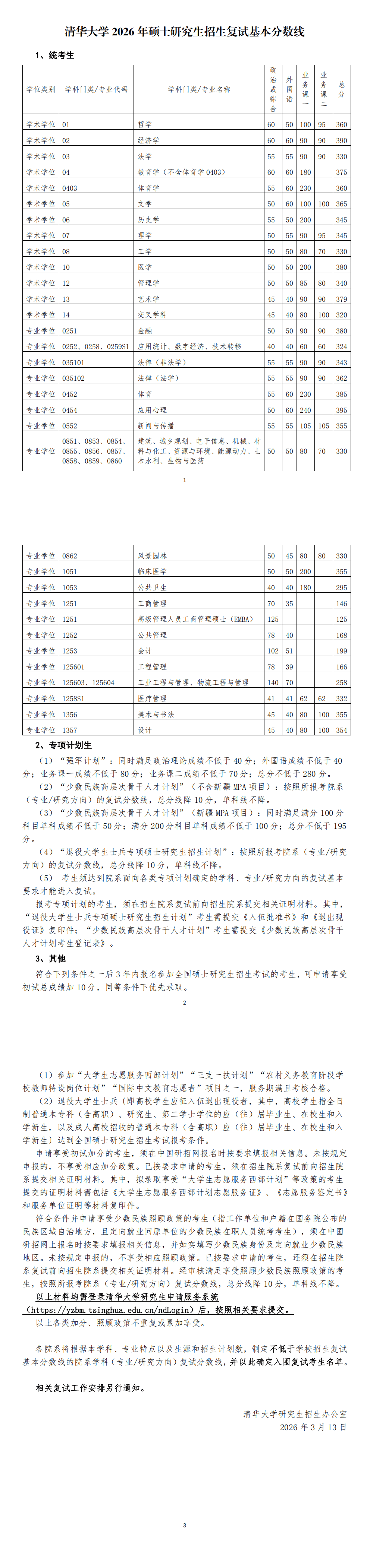 清华大学2026年硕士研究生招生复试基本分数线