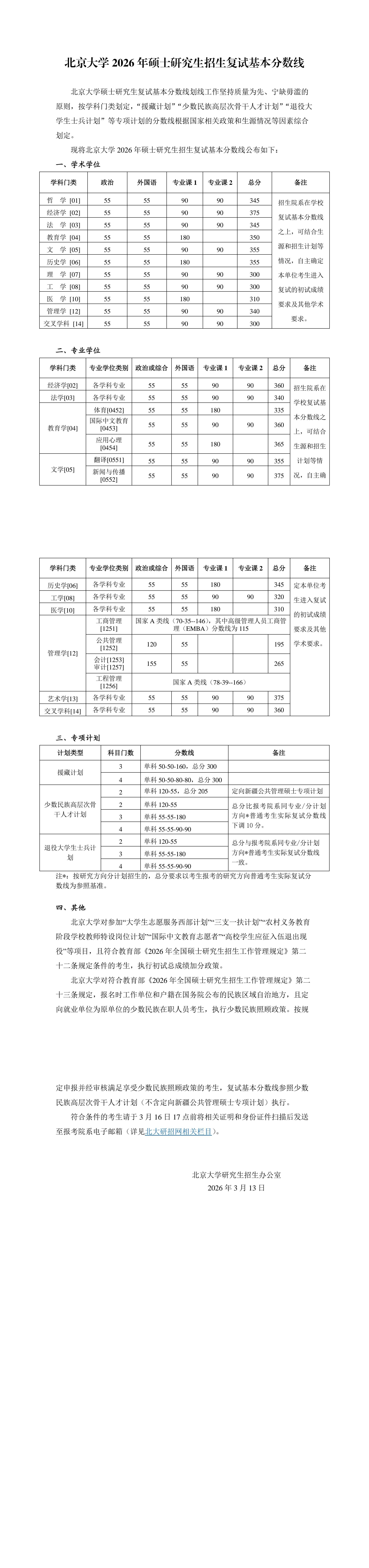 现将北京大学2026年硕士研究生招生复试基本分数线公布如下: