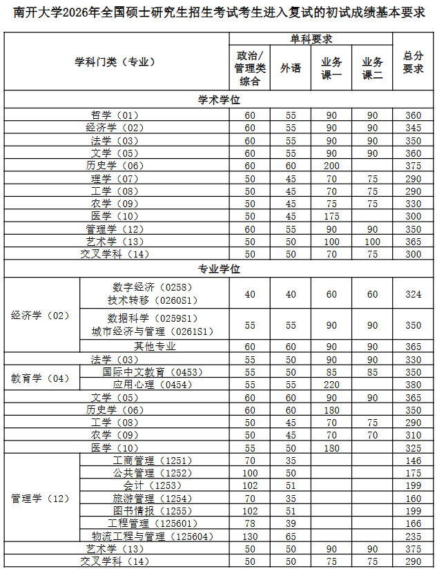 南开大学2026年硕士研究生复试的初试成绩基本要求