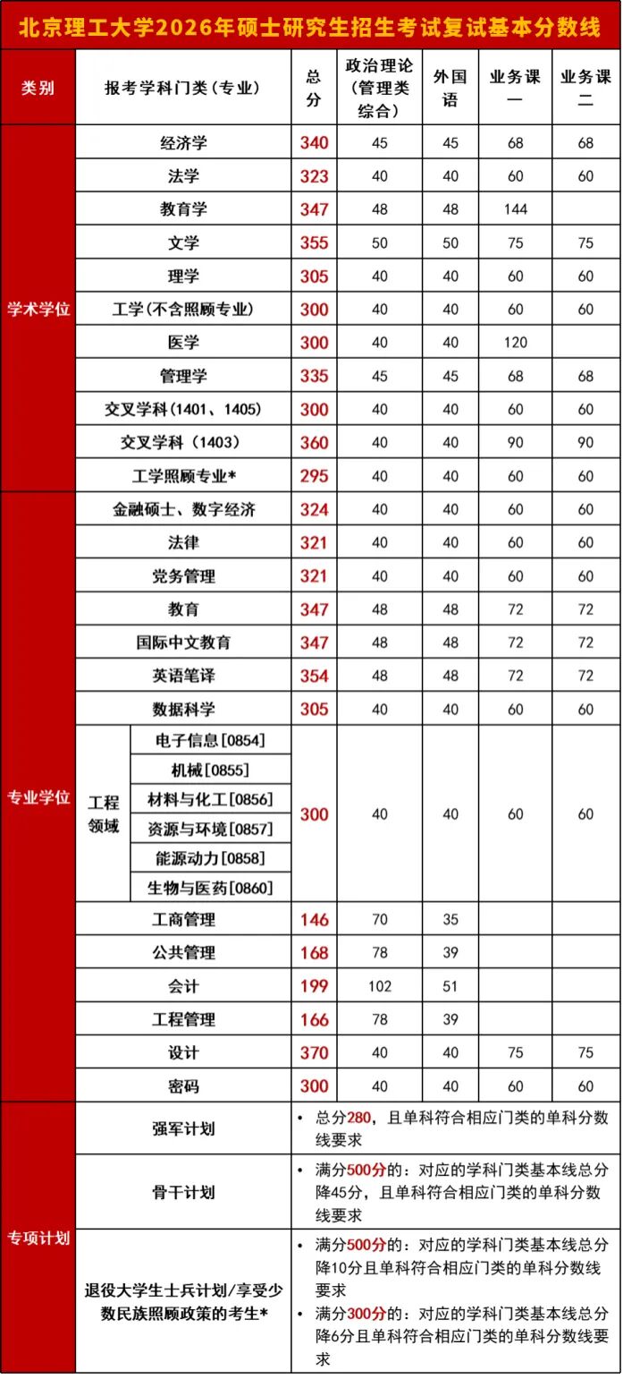 北京理工大学2026年硕士研究生招生考试复试基本分数线