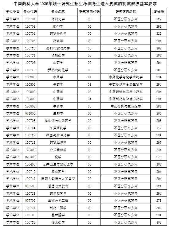 原标题:中国药科大学2026年硕士研究生招生考试考生进入复试的初试成绩基本要求