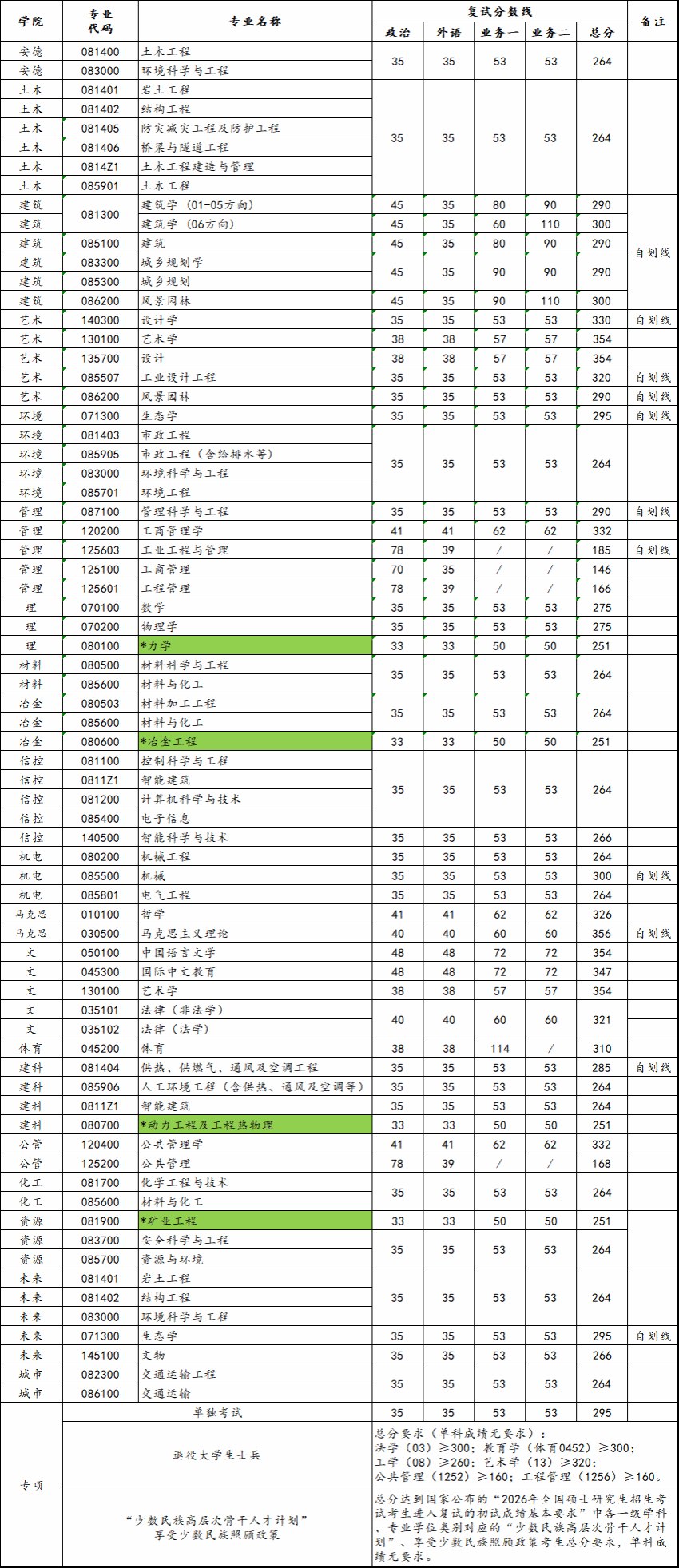 根据教育部相关文件精神及《2026年全国硕士研究生招生考试考生进入复试的初试成绩基本要求》,结合我校硕士研究生招生工作实际,现将西安建筑科技大学2026年硕士研究生招生复试分数线及相关信息公布如下。