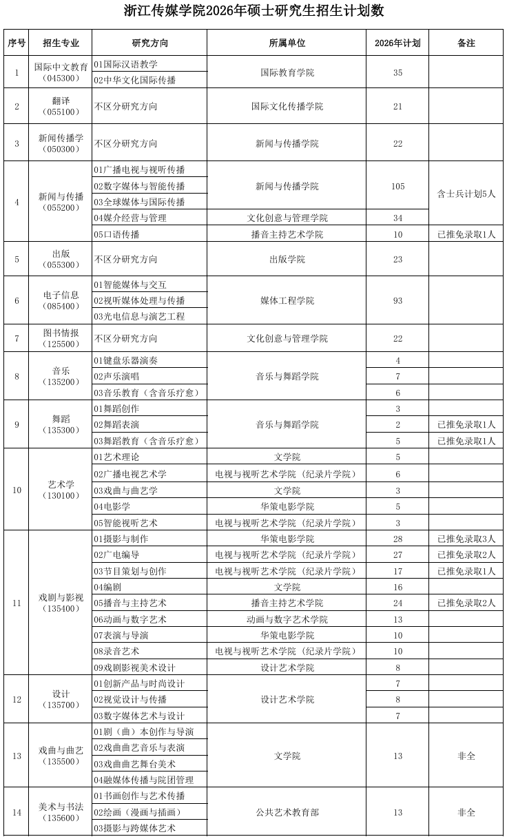 根据教育部《2026年全国硕士研究生招生工作管理规定》和《浙江传媒学院2026年硕士研究生招生复试录取工作方案》,结合学校实际情况,现将2026年硕士研究生招生各专业(研究方向)计划数公布如下: