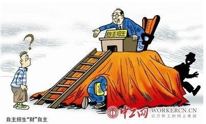 自主招生“财”自主 李法明 画 大学校园原本被誉为社会净土,公德良心的最后底线,但近日中国人民大学招生处处长蔡荣生涉嫌招生贪腐一事震动了整个社会。 “一个大学的处长...
