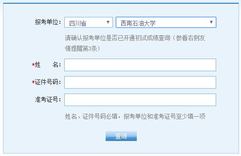 四川2017考研初试成绩查询入口开通,西南石油大学分数可查。报考本研招单位的考生可登录研招网通过姓名、研招单位、证件号、准考证号查询成绩。为下一步复试调剂做好准备。更多其他省市...