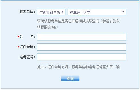 广西2017考研初试成绩查询入口开通,桂林理工大学分数可查。报考本研招单位的考生可登录研招网通过姓名、研招单位、证件号、准考证号查询成绩。为下一步复试调剂做好准备。更多其他省市...