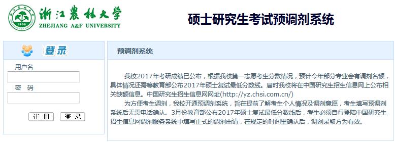 浙江农林大学2017年考研调剂:“预调剂系统”开通 浙江农林大学2017年考研成绩已公布,根据浙江农林大学第一志愿考生分数情况,预计部分专业有调剂名额,具体情况待国家线出台以后,...