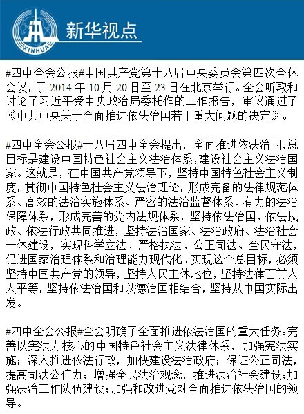 历时4天的中国共产党第十八届中央委员会第四次全体会议(简称十八届四中全会)于10月23日在京闭幕,大家翘首期待的会议公报(即《中共中央关于全面推进依法治国若干重大问题的决定》)...